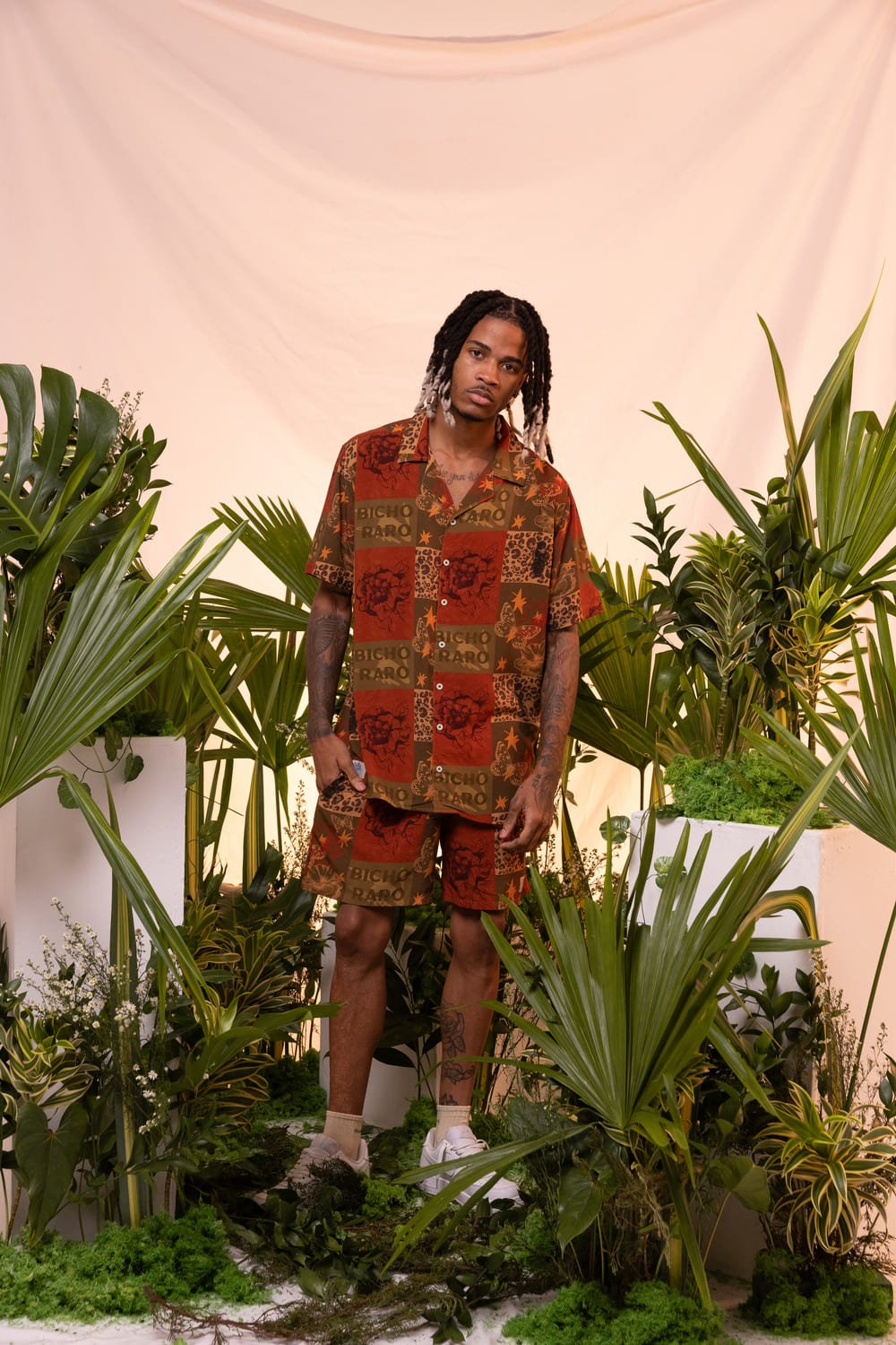 This isn’t just a shirt; it’s a conversation piece. The design showcases a bold patchwork aesthetic in warm rust and earth tones, mixing illustrations of butterflies, stars, and leopard spots with the signature “BICHO RARO” text. It represents transformation and individuality for the modern man.