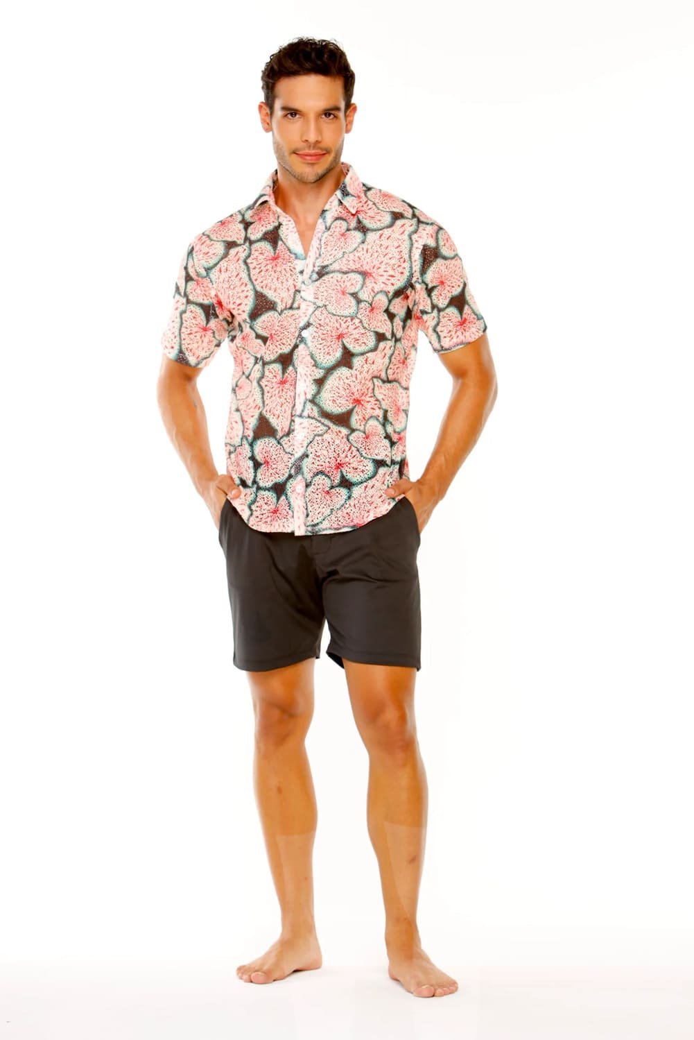This shirt reinterprets the classic botanical print with a modern artistic touch. Crafted from our signature breathable mesh fabric, it keeps you cool while offering a sophisticated texture. The design features large tropical leaves composed of intricate dot patterns in vibrant pink and deep teal tones, making it a unique piece for your Curazao getaway.