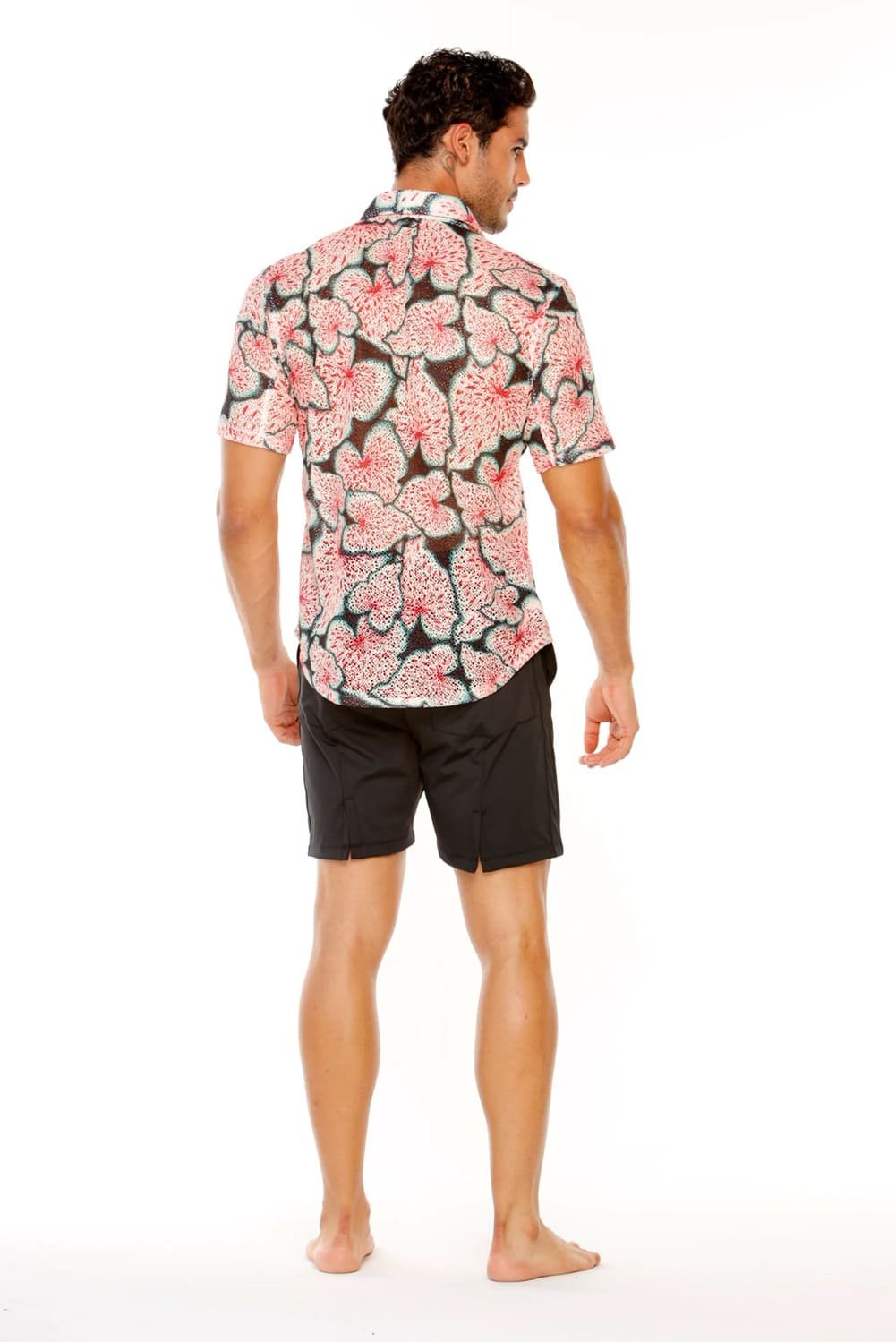 Stand out in paradise with the Pink Tropical Leaf Mesh Shirt, exclusively at New Model.