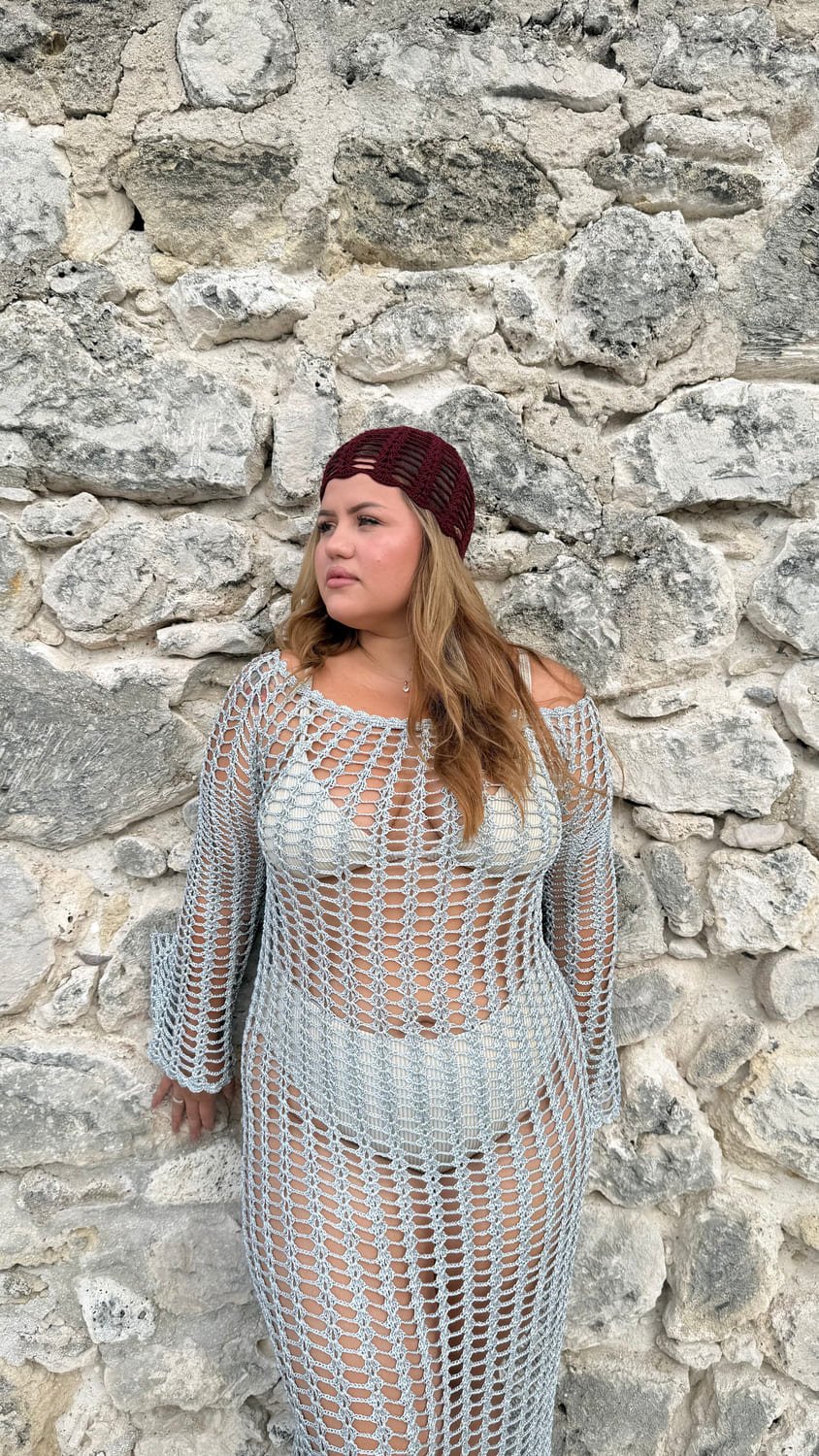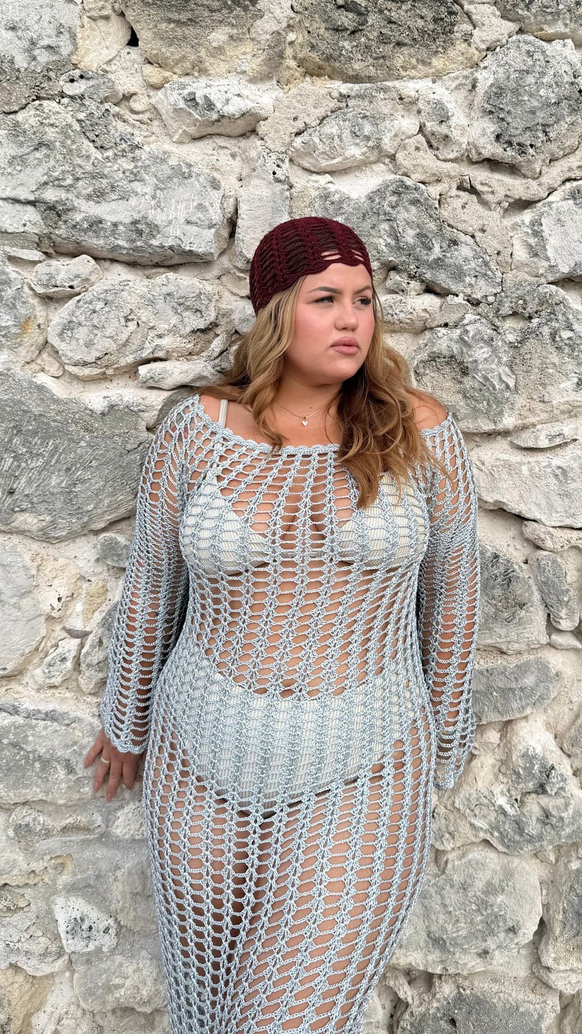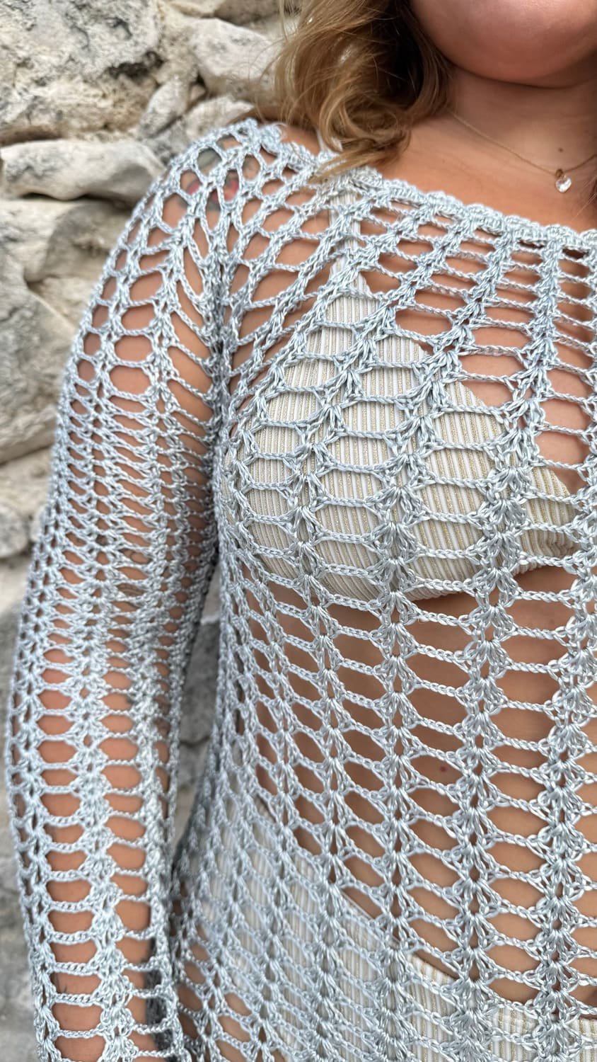 Shine under the Caribbean sun with the Silver Shimmer Crochet Cover-Up.