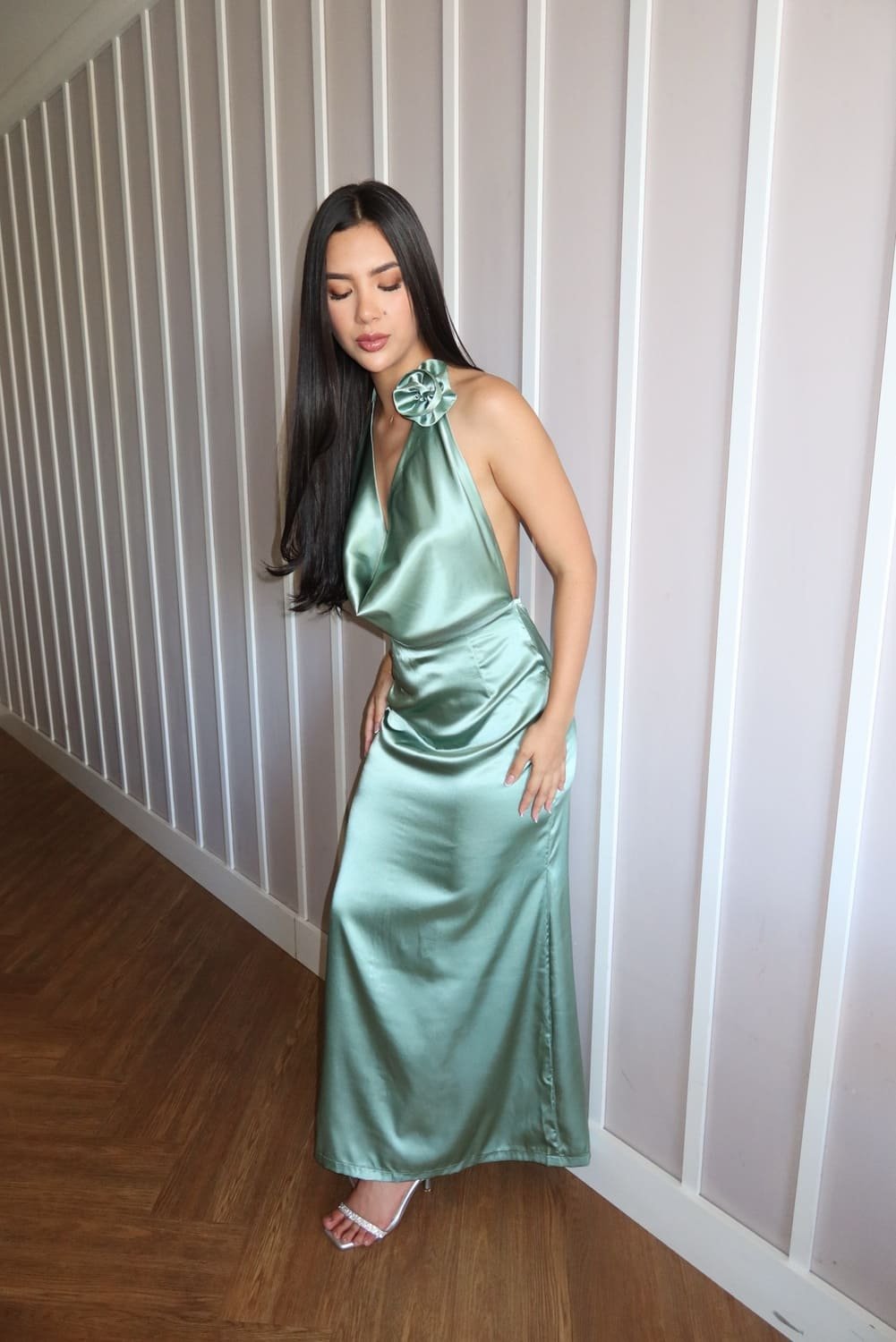 This exquisite gown is defined by its luxurious soft silk fabric that drapes effortlessly over the body, creating a luminous sheen that captures the light with every movement. The centerpiece of this design is the stunning 3D floral application at the halter neckline, framing the face beautifully above a sophisticated cowl neck bodice.