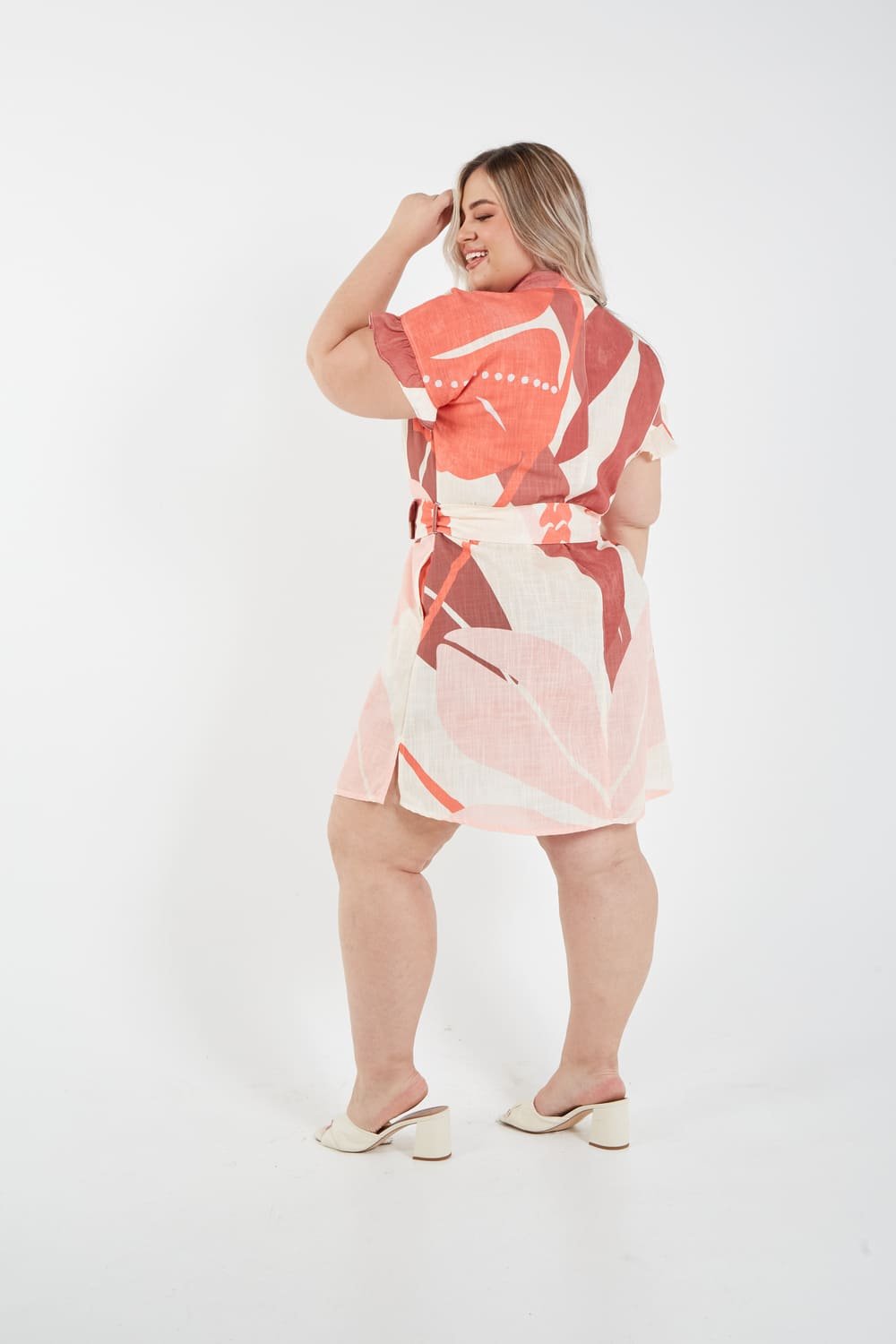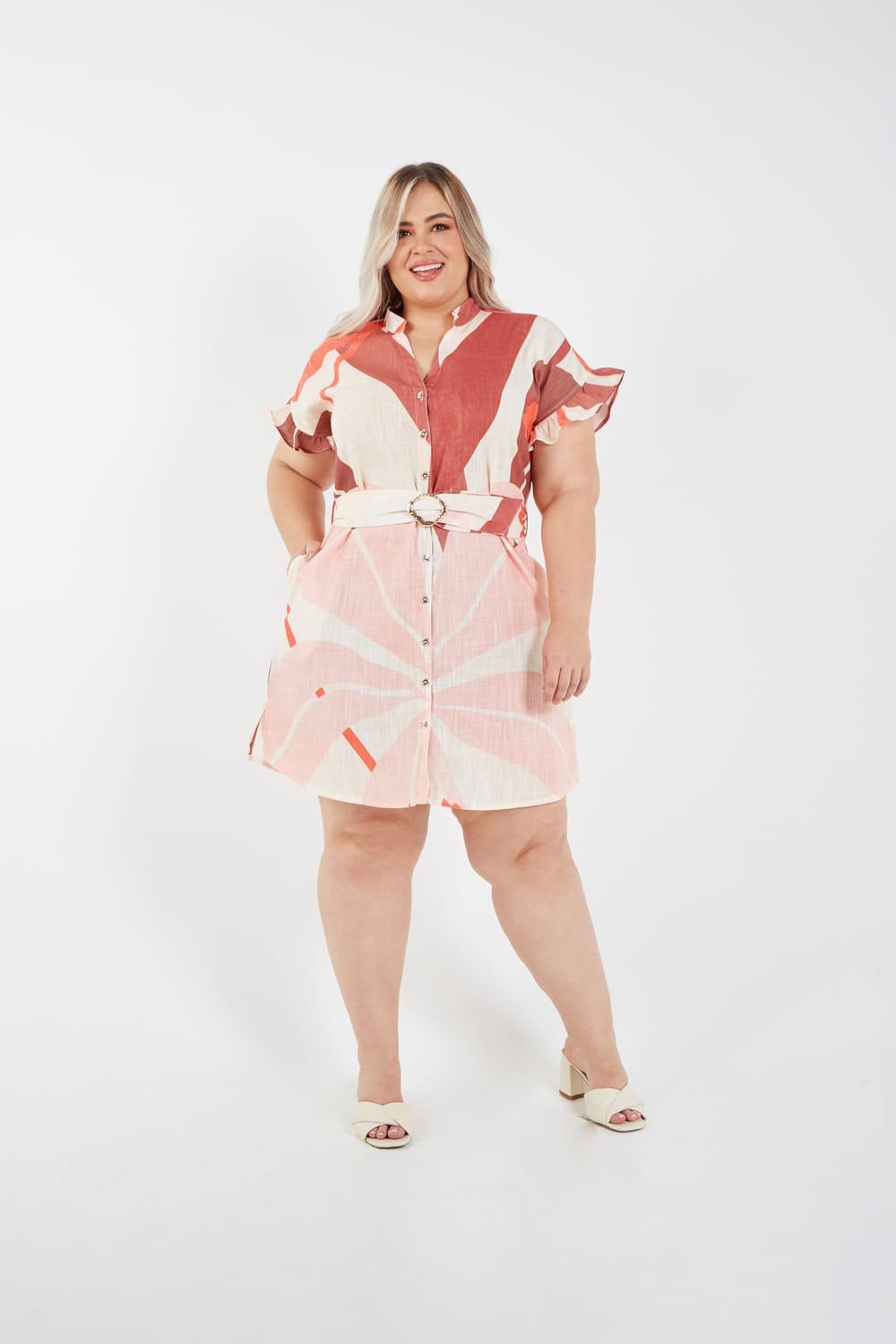 This dress is the perfect combination of structure and softness. Its eye-catching print features large, abstract petals in warm coral, pink, and terracotta tones, creating a fresh look that screams summer. The classic shirt-dress silhouette with front buttons offers a polished feel, while the ruffled sleeves add a touch of romance and movement.